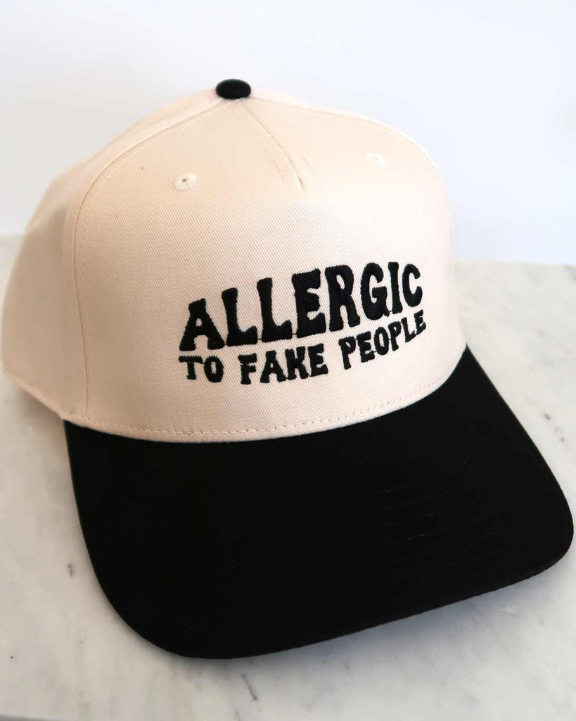 Make a statement with the "Allergic to Fake People" Embroidered 5-Panel Cap, designed for those who keep it real. This structured mid-profile baseball cap features a seamless full buckram front panel for a sleek and durable look. Crafted from a premium 65% polyester / 35% cotton blend, this hat delivers both comfort and long-lasting wear.