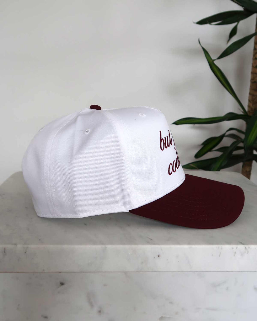 "But First, Cocktails" Embroidered Hat – Maroon & White 90s-Inspired Cap
