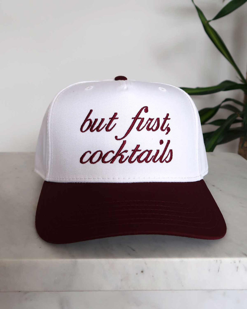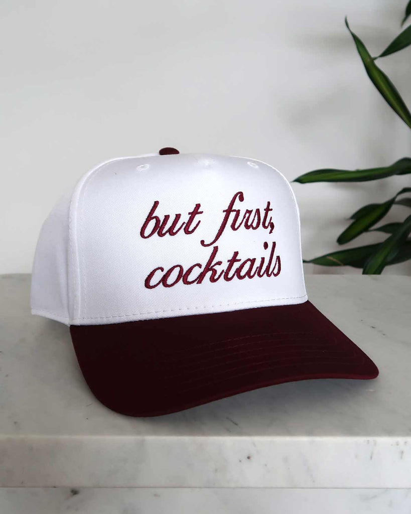 Kick off happy hour in style with the "But First, Cocktails" Embroidered Hat. This two-tone maroon and white cap features bold, crisp embroidery in a playful 90s-style font that brings a retro twist to your favorite going-out look.