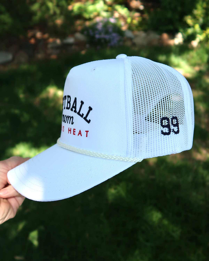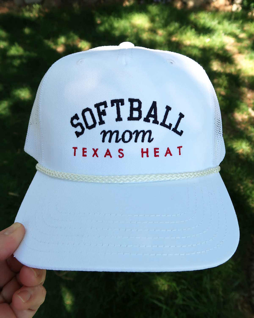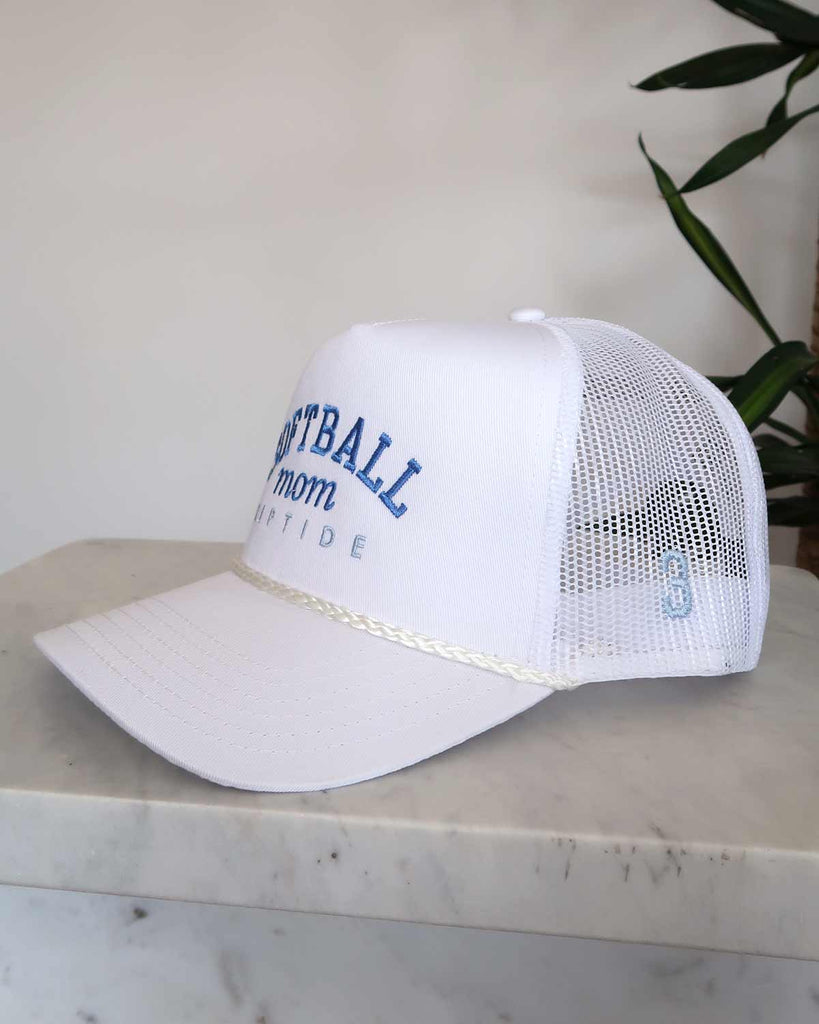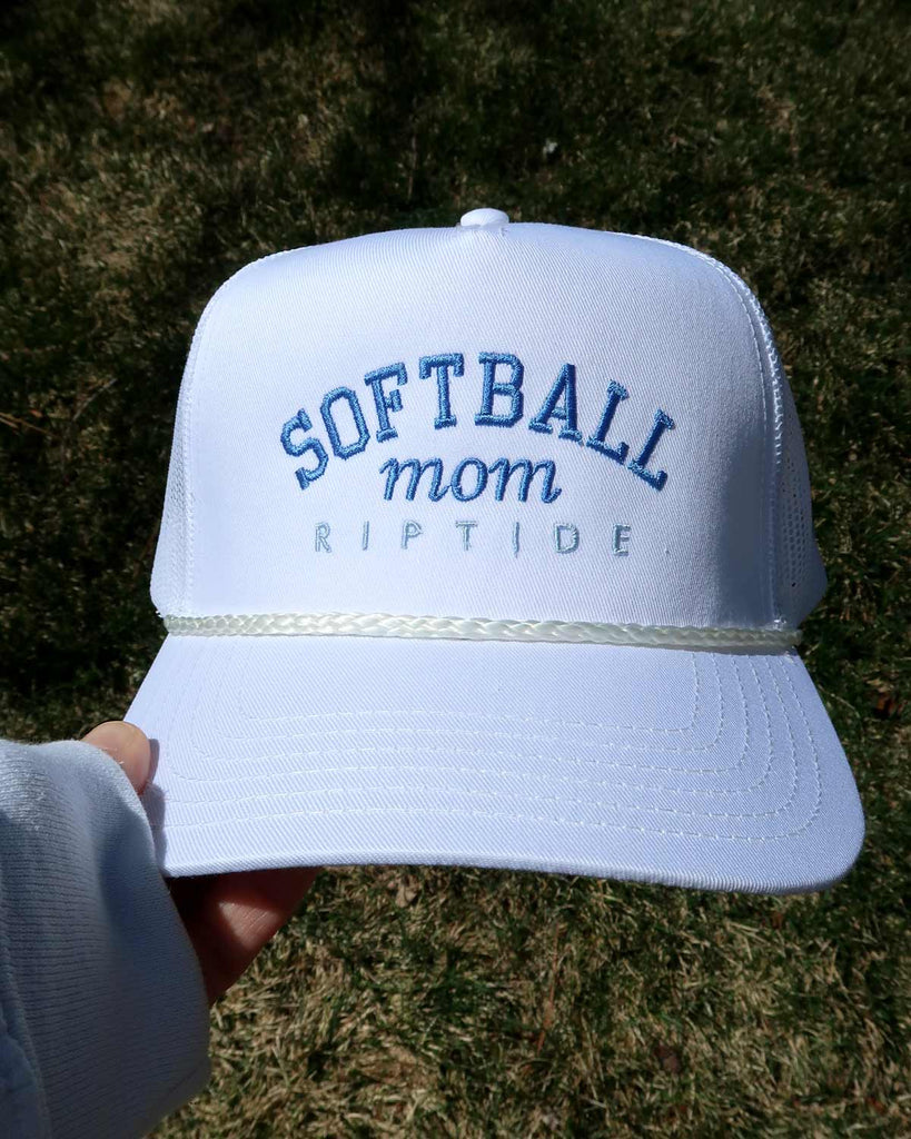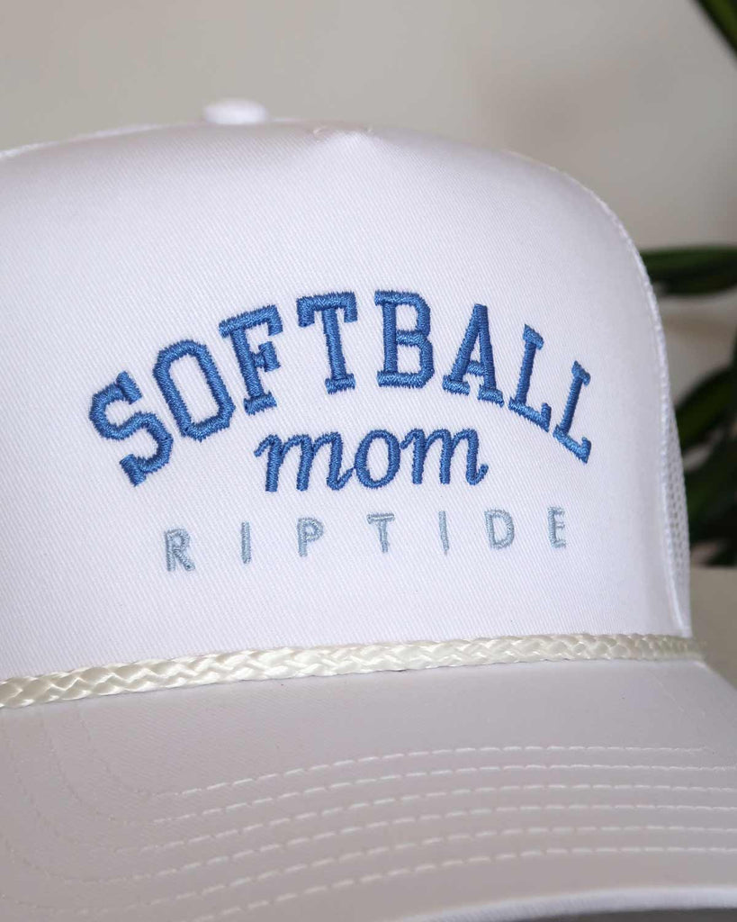 Softball Mom with Team Embroidered Hat - White Rope Trucker Hat with Custom Tread Color, Team Name, and Player Number