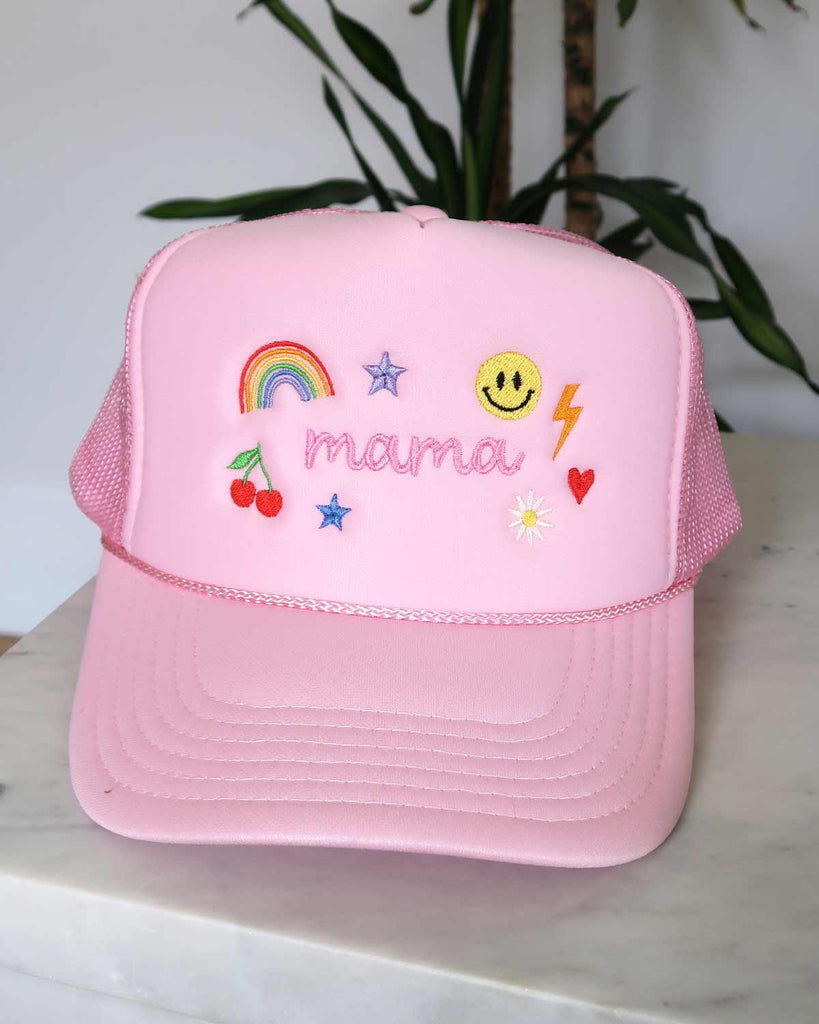 Make every outfit extra special with our Mama Charm Pink Embroidered Trucker Hat in light pink! Show of your motherhood with "mama" in a stylish script, surrounded by playful embroidered charms including a rainbow, stars, cherries, a smiley face, lightning bolt, heart, and daisy. Designed for comfort and style, this trucker hat features a breathable mesh back, a soft terrycloth band, a trendy rope detail on the brim, and an adjustable snapback closure for a perfect fit.
