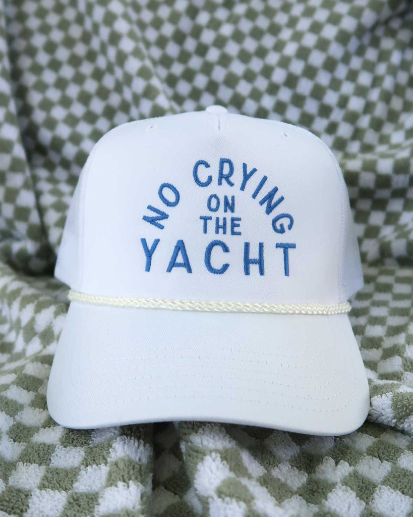 Make a bold, coastal statement with our "No Crying on the Yacht" unisex trucker hat. Featuring a classic cotton front and breathable mesh back, this solid white cap includes a vintage-inspired rope detail and blue embroidery in Taylor Penton's playful handmade font. Whether you're sailing or just vibing dockside, this high-quality hat blends preppy charm with laid-back attitude. One size fits most. Ideal for beach days, boat trips, and summer escapes.