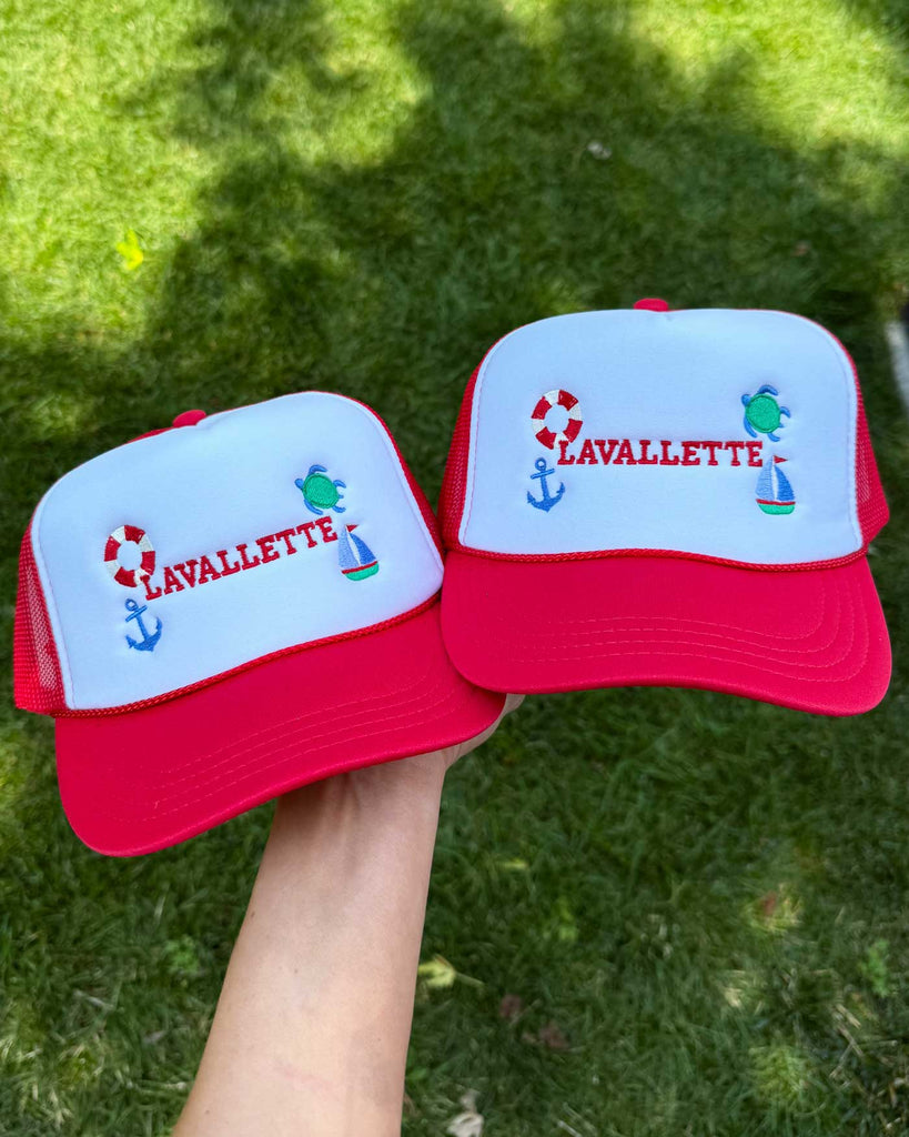 Personalized Nautical Kids Trucker Hat – Red & White with Embroidered Charms
