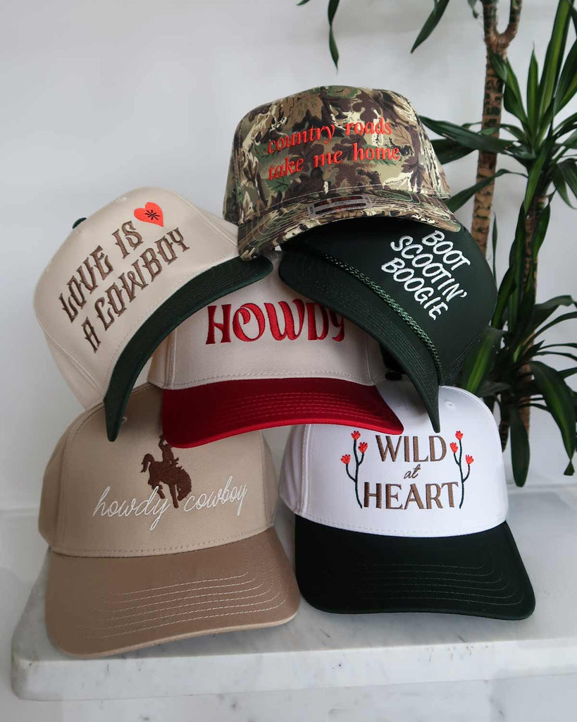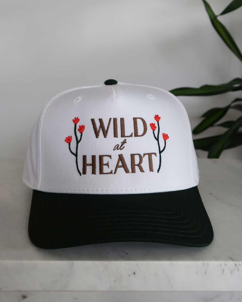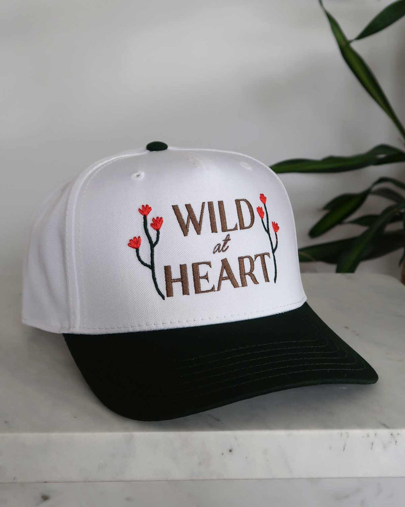 Let your free spirit shine with our "Wild at Heart" Embroidered Hat. This stylish 5-panel cap features crisp, luxurious embroidery of the phrase “Wild at Heart” with delicate flowers on each side — a design that’s both bold and beautifully balanced.