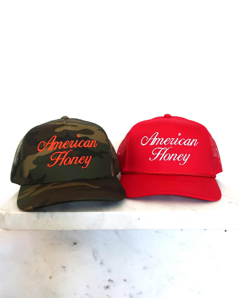 Crisp White Embroidery: “American Honey” is stitched in elegant cursive for a clean, classic contrast that pops against the bright red backdrop.