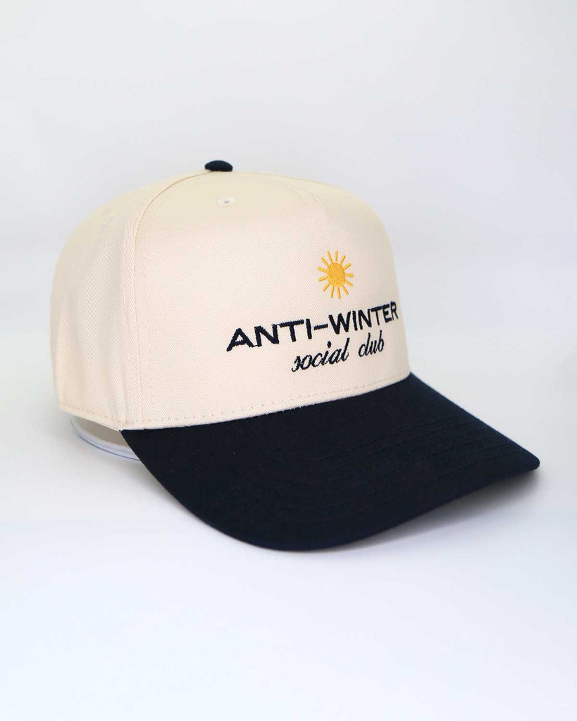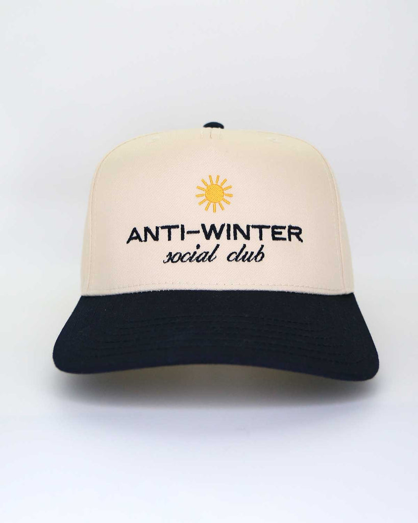 Stay sunny year-round in our ANTI-WINTER Social Club hat. This two-tone 5 panel cap features a natural crown with a contrasting navy brim, embroidered in bold navy thread with “ANTI-WINTER” and “social club” in script beneath a bright yellow sun. Perfect for coastal cowgirls, summer lovers, and anyone who’d rather chase sunshine than snow. Designed with a comfortable fit, adjustable closure, and laid-back style that makes it a must-have accessory for festivals, beach days, or everyday wear. A unique embroidered hat that adds personality to any outfit, this cap makes a fun gift for sun chasers and warm-weather fans.