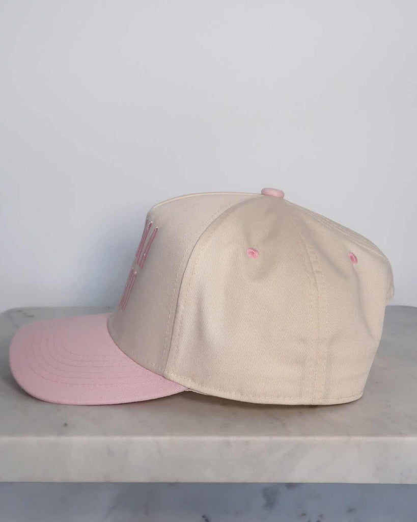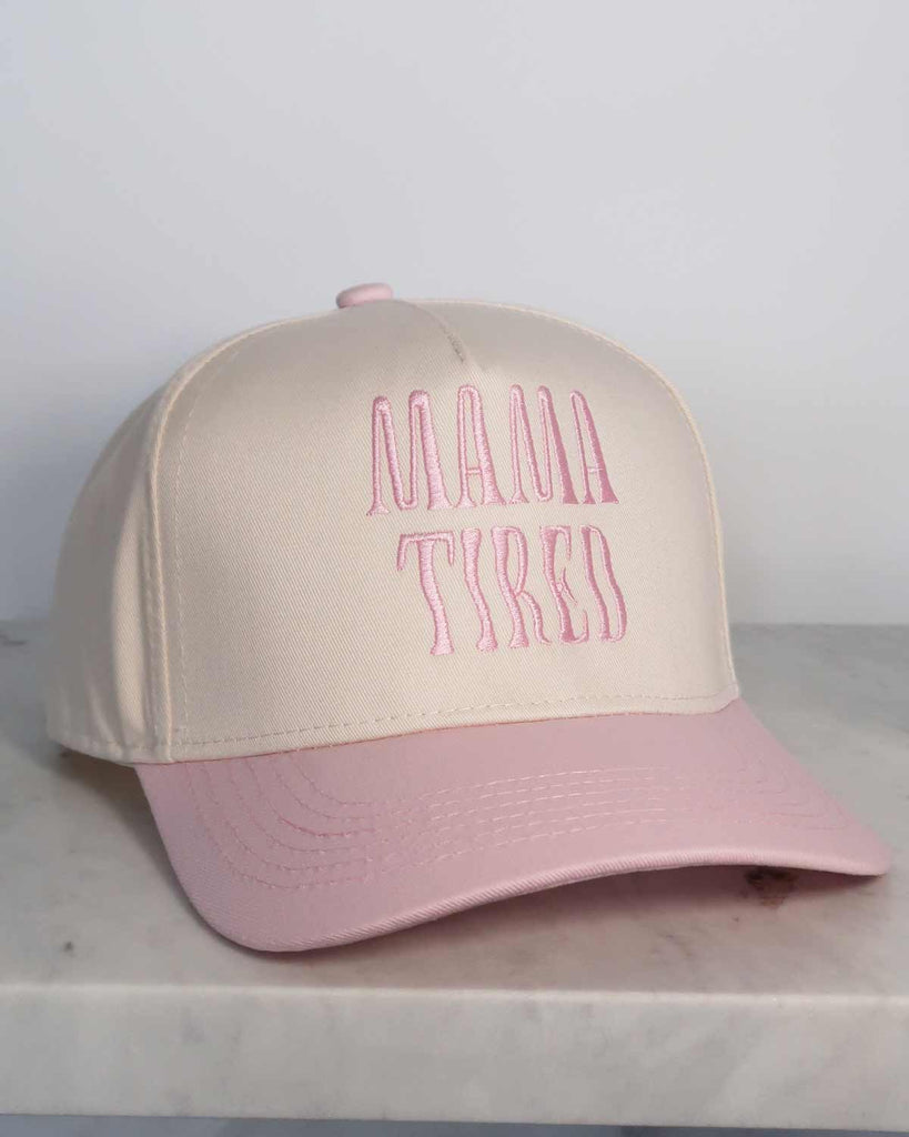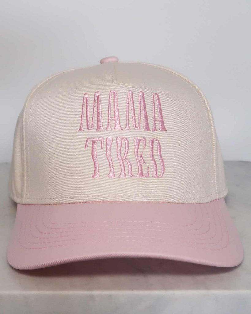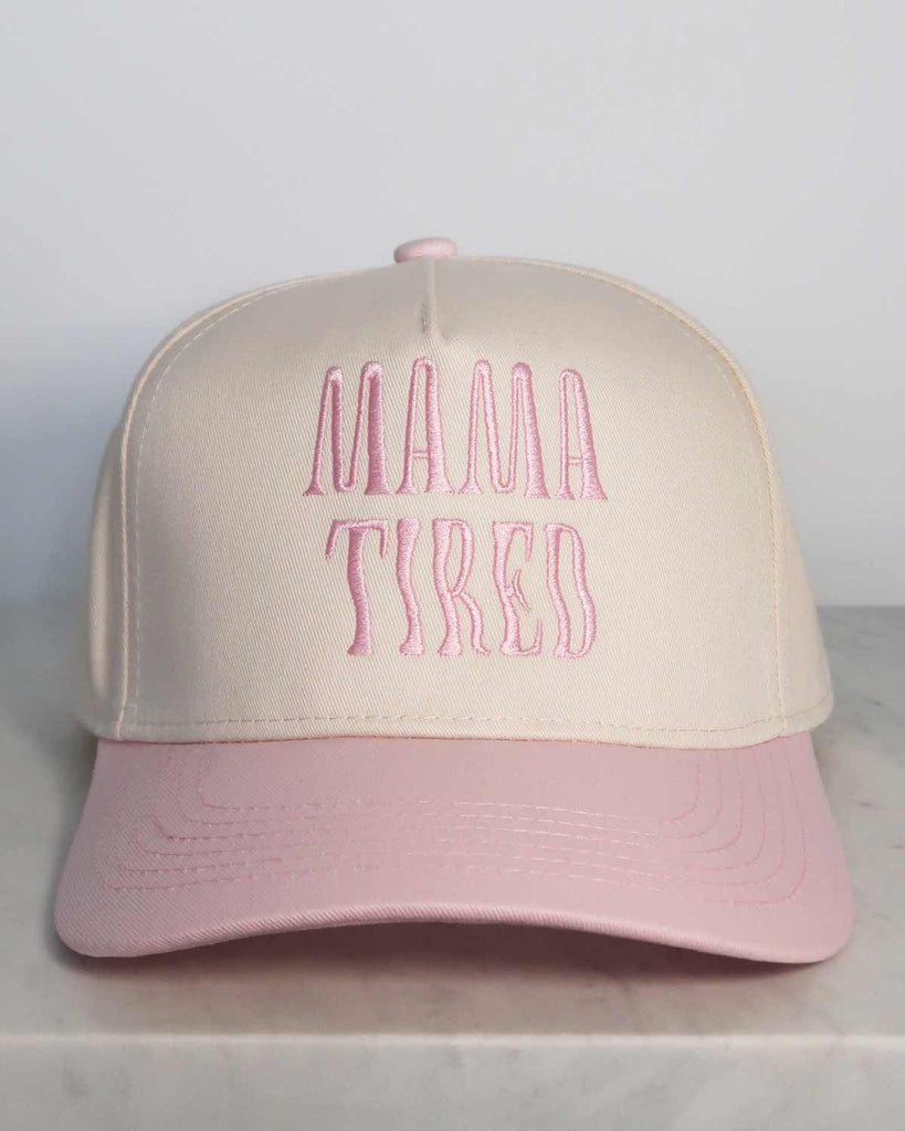 "Mama Tired" 5-Panel Embroidered Hat – Neutral Crown & Light Pink Brim