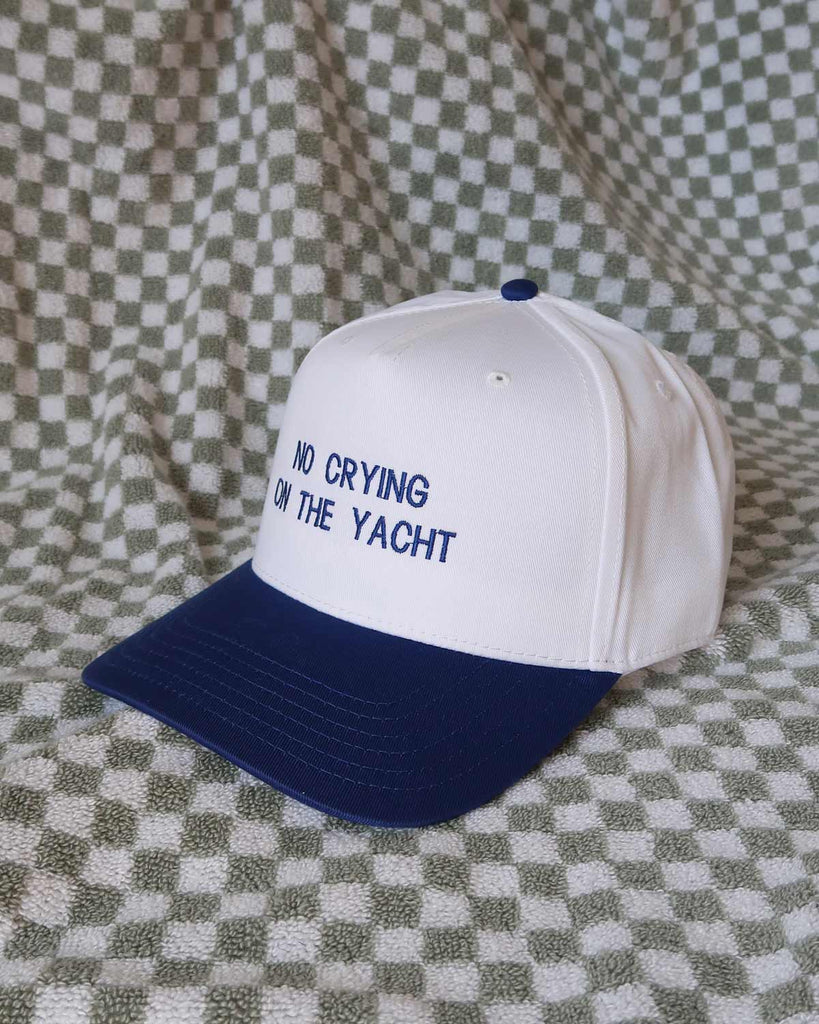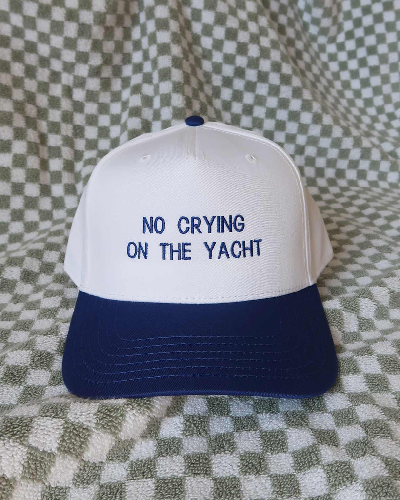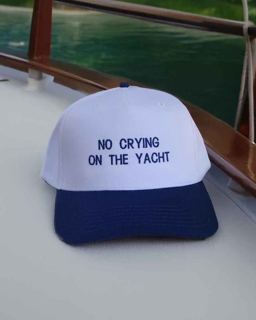 Make a bold statement with our 5-panel two-tone hat in royal blue and white, featuring 'NO CRYING ON THE YACHT' embroidered in clean, all-caps lettering. This structured cap blends laid-back luxury with sharp style—perfect for boat days, beach clubs, or making waves anywhere you go. Adjustable fit, high-quality embroidery, and yacht-club attitude included.