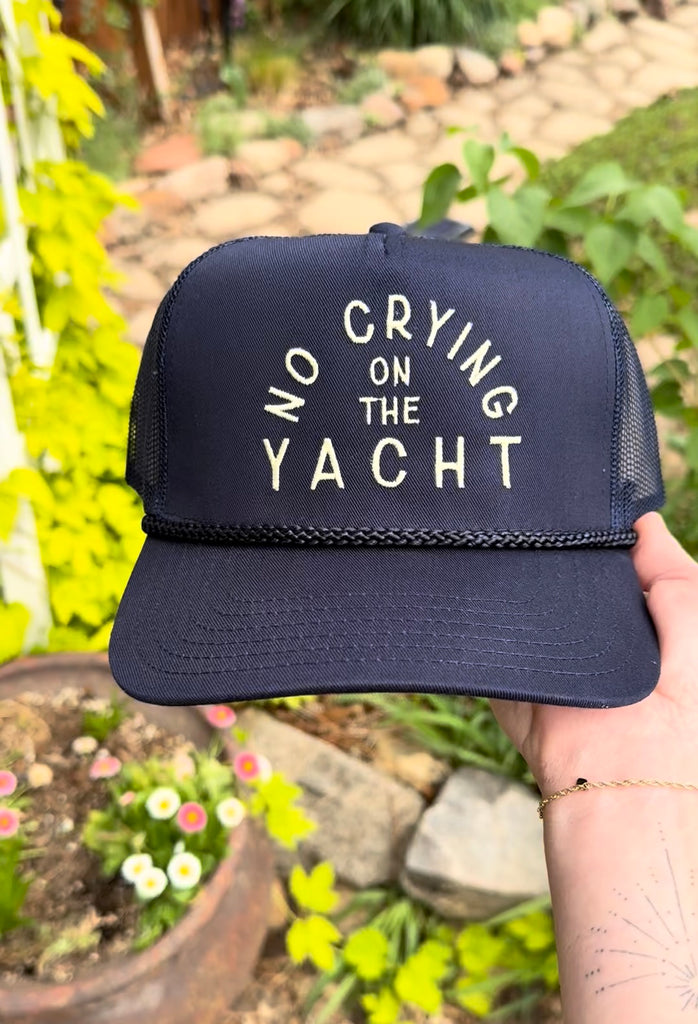 Make a bold, coastal statement with our "No Crying on the Yacht" unisex trucker hat. Featuring a classic cotton front and breathable mesh back, this solid navy cap includes a vintage-inspired rope detail and butter yellow embroidery in Taylor Penton's playful handmade font. Whether you're sailing or just vibing dockside, this high-quality hat blends preppy charm with laid-back attitude. One size fits most. Ideal for beach days, boat trips, and summer escapes.
