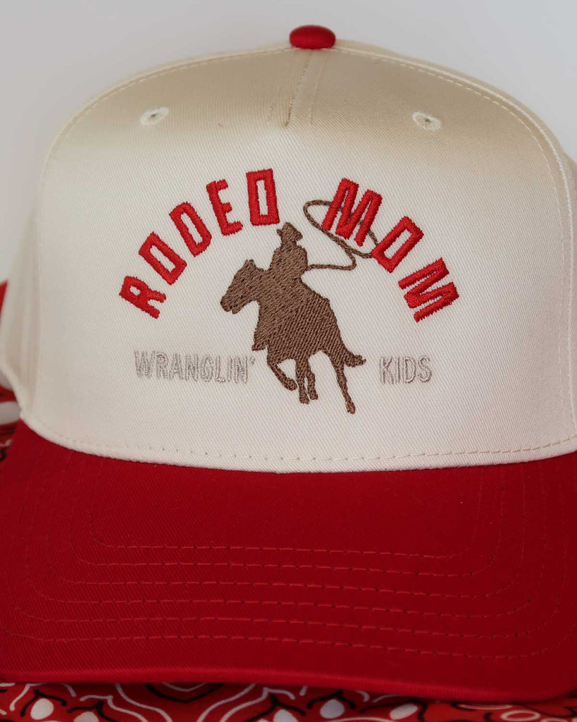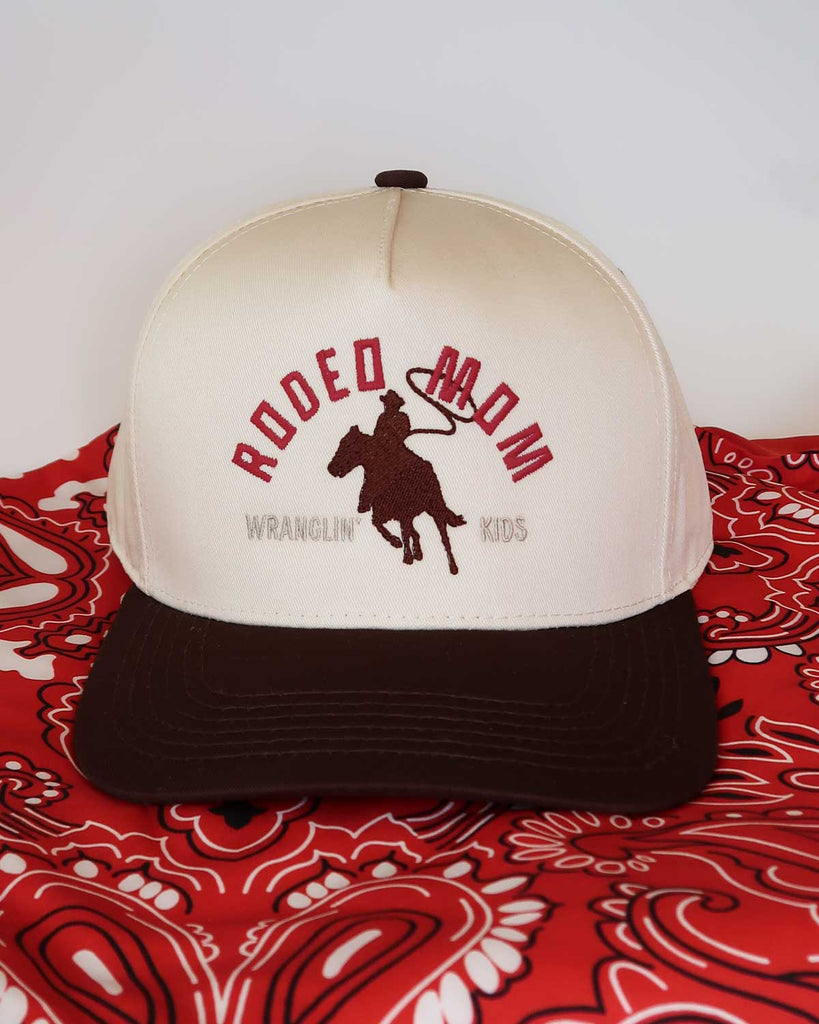 Below, in soft neutral thread, “Wranglin’ Kids” adds a subtle, everyday charm that makes this cap perfect for moms who balance grit, grace, and a whole lot of love.