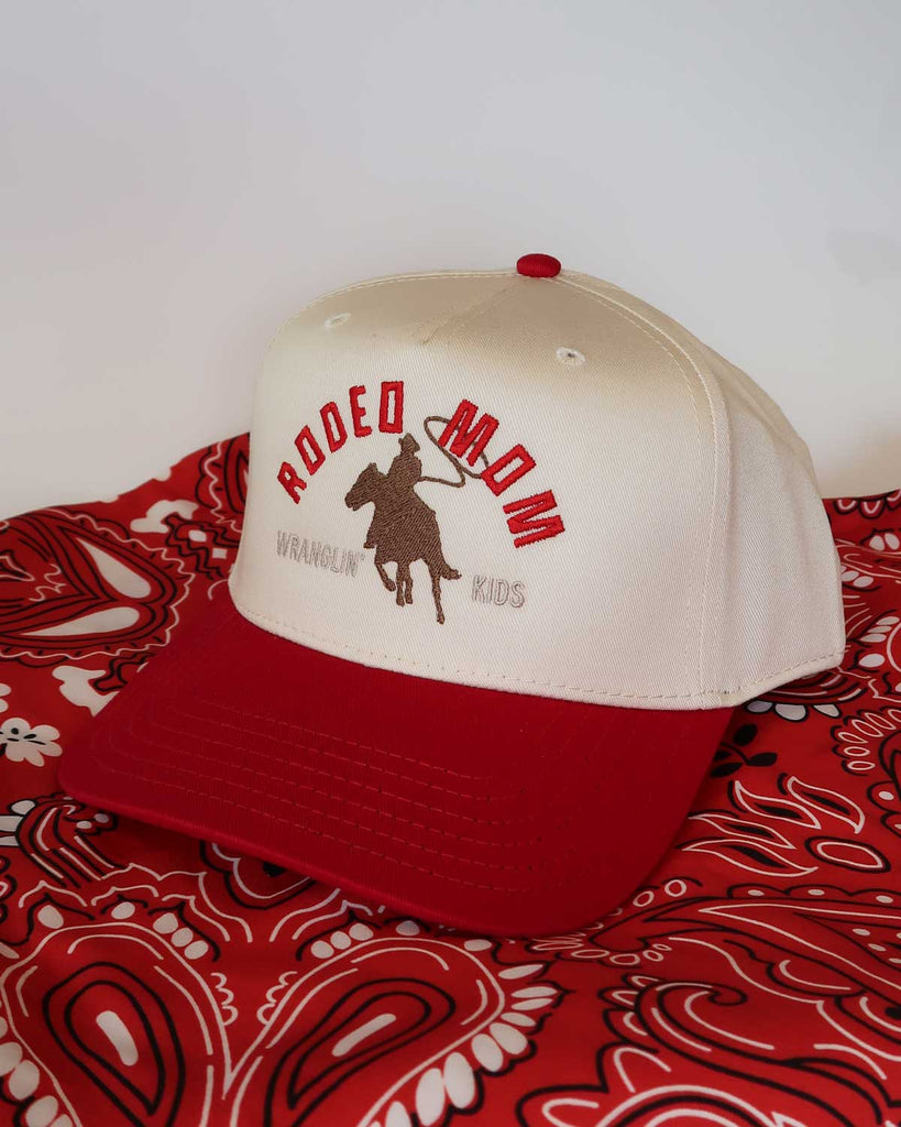Show off your western spirit with our “RODEO MOM” Two-Tone 5 Panel Hat, a bold and stylish nod to every mom who’s always wranglin’ kids and running the show. Embroidered in Taylor Penton’s signature designer font, this hat features a cowgirl riding a horse, with her rope lasso looping around the “M” in MOM — a playful, detailed touch that captures the heart of rodeo life.