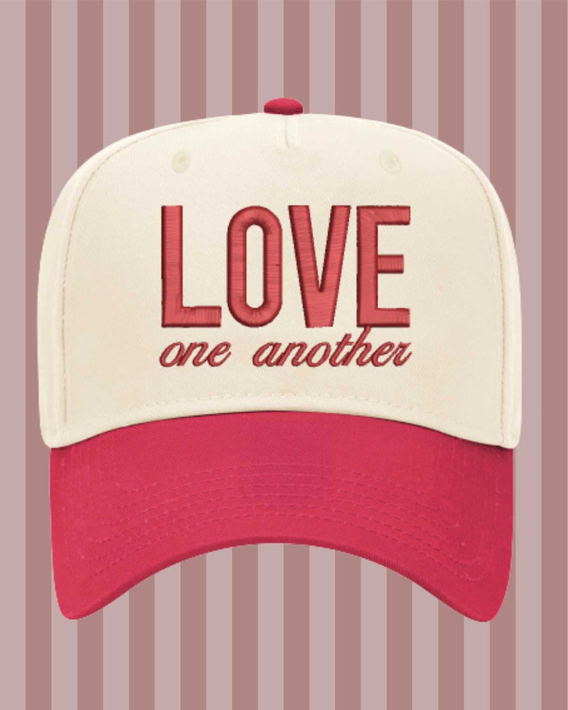 A timeless, feel-good embroidered hat designed to spread joy on Valentine’s Day and all year long. This natural and red two-tone 5-panel hat features “LOVE” embroidered in 3D puff bold lettering, with “one another” stitched below in a fun script, all in rich red thread. A meaningful statement piece that pairs classic style with an uplifting message—perfect for gifting, everyday wear, and sharing love wherever you go.