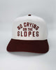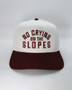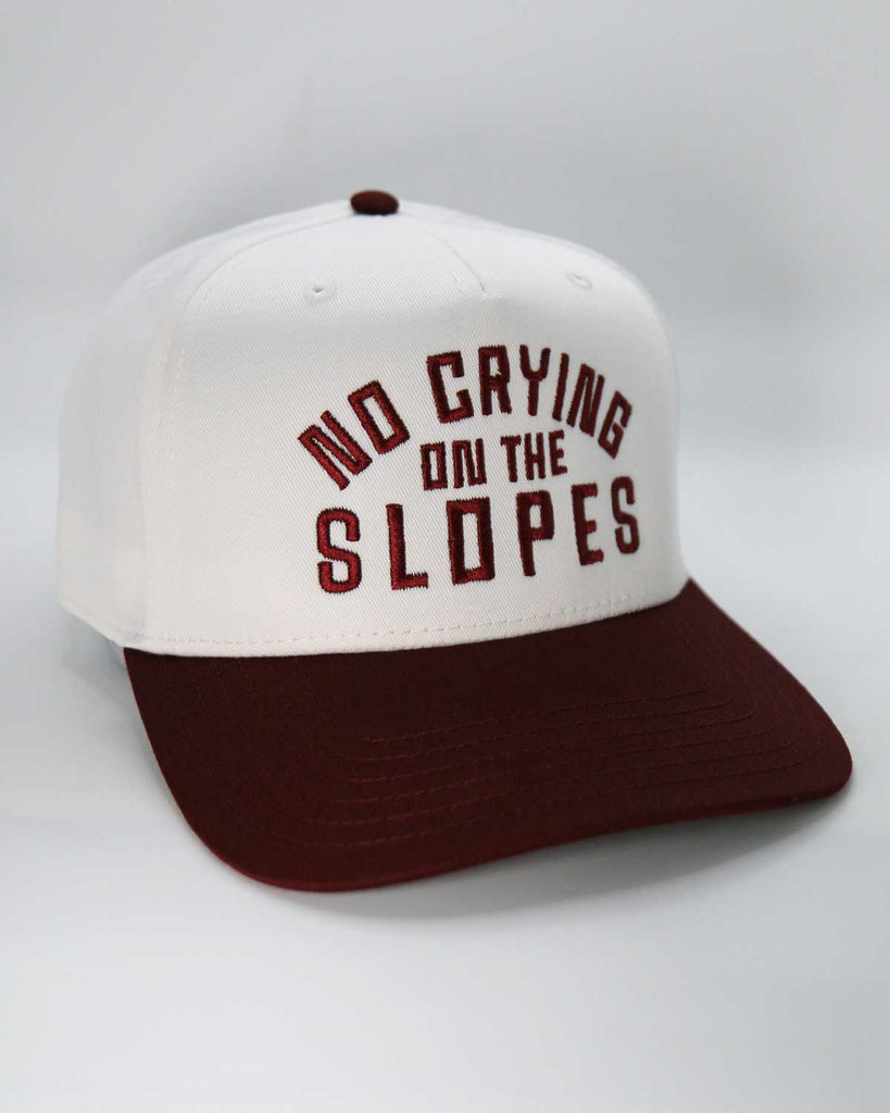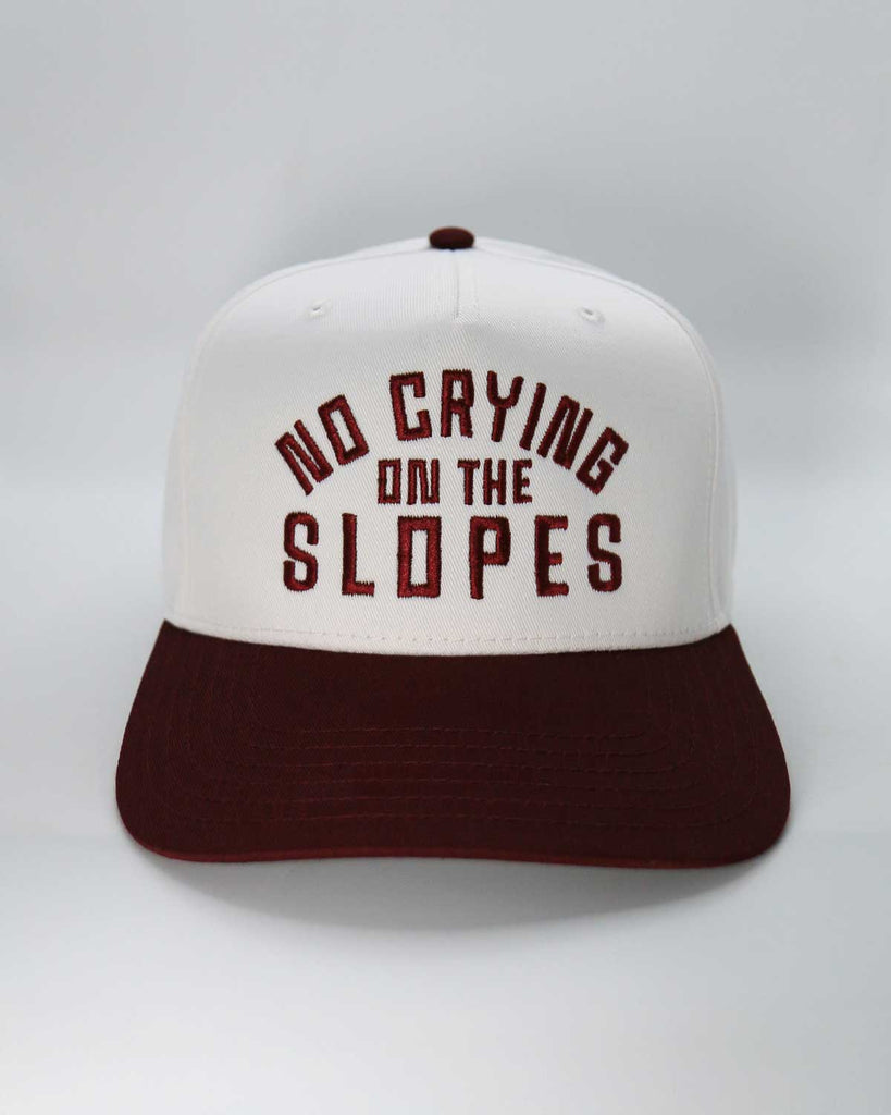 Serve attitude on the mountain with this statement-making 5-panel embroidered hat. Designed with a crisp natural crown and a rich burgundy brim, this cap features bold embroidered lettering that reads “No Crying on the Slopes.” Equal parts funny, confident, and effortlessly cool, it’s made for ski days, après hangs, and anyone who prefers their mountain style with a little edge. Comfortable, eye-catching, and perfect for gifting or keeping all season long.
